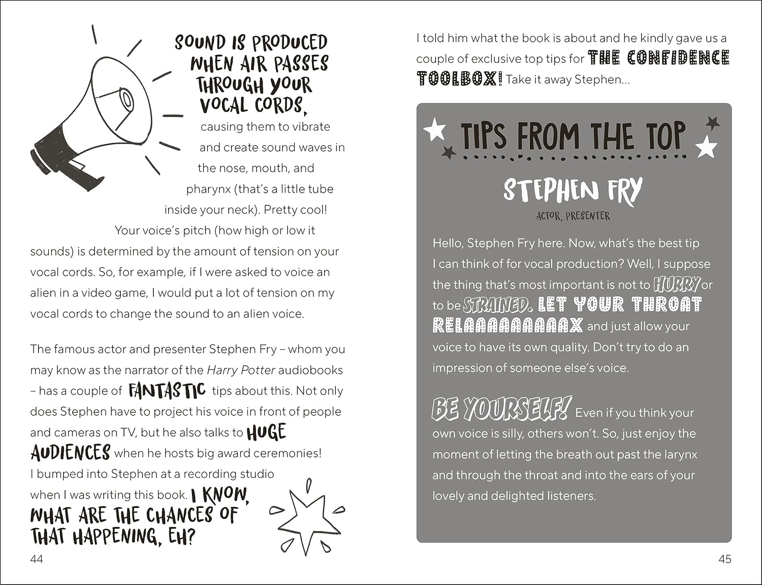 Packed with funny stories from Lizzie’s world of cartoons, and top tips from a host of professional voice artists and public figures, such as Stephen Fry, David Menkin, and BBC presenter Ben Shires, this book is full of practical advice to help you find your voice!