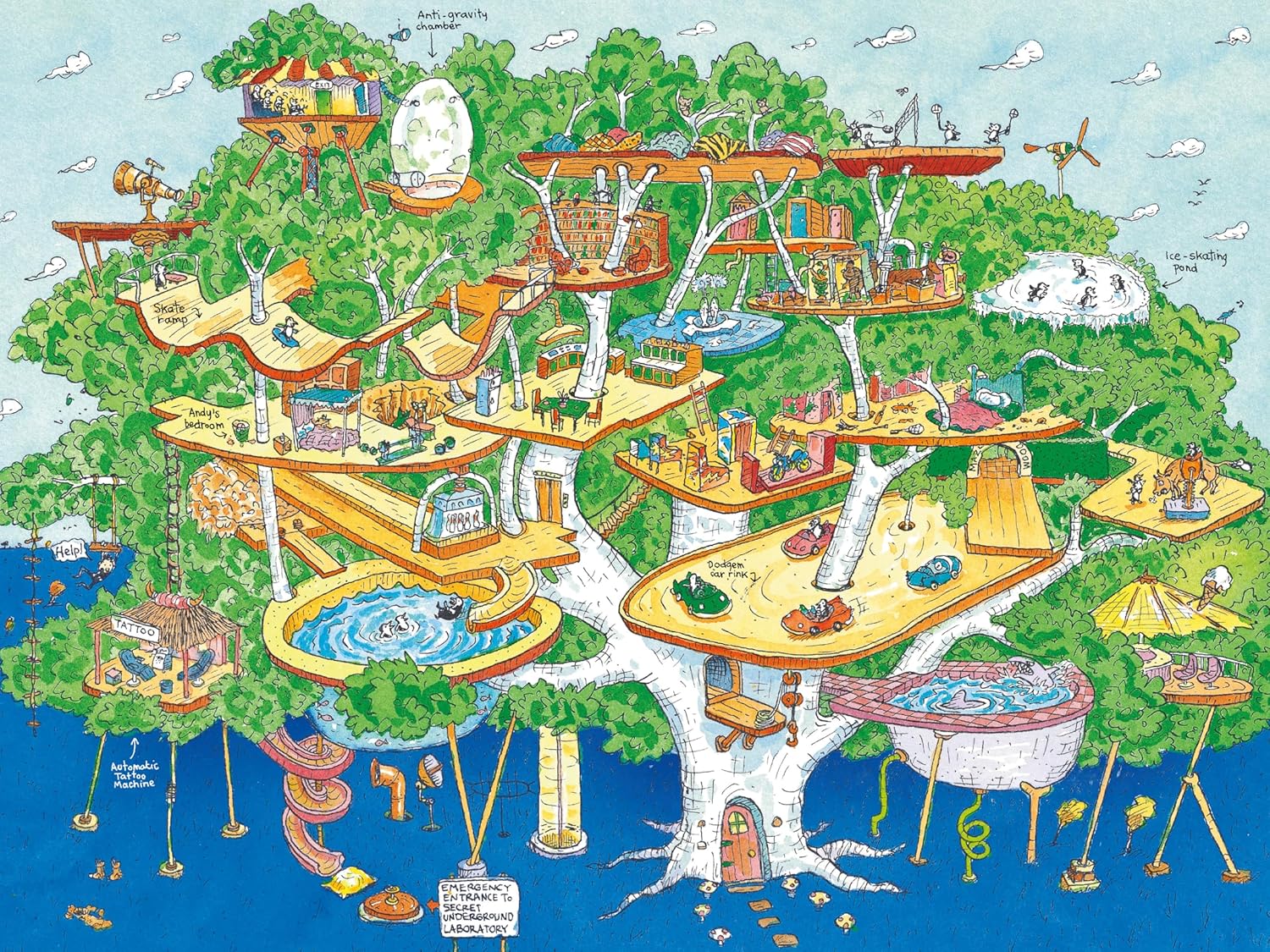 Andy and Terry have expanded their treehouse! There are now thirteen brand-new storeys, including a dodgem-car rink, a skate ramp, a mud-fighting arena, an antigravity chamber, an ice-cream parlour with seventy-eight flavours run by an ice-cream-serving robot called Edward Scooperhands, and the Maze of Doom – a maze so complicated that nobody who has gone in has ever come out again . . . Well, not yet anyway.