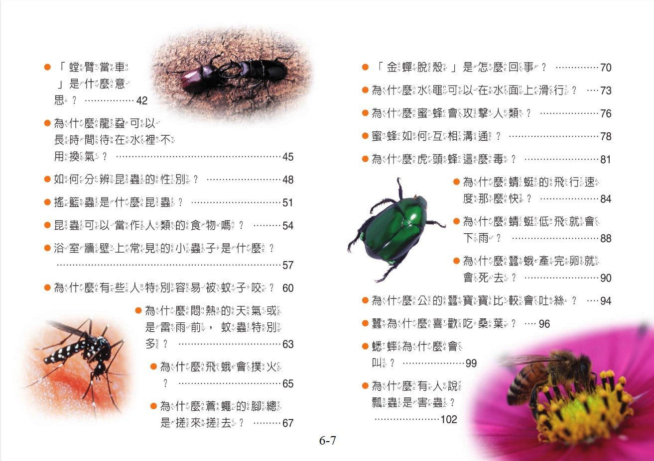 仔細觀察我們周遭的環境,天上飛的鳥、地上跑的狗,都與我們呼吸相同的空氣,卻不一定和昆蟲一樣,與我們住在同一個屋簷下。昆蟲究竟是怎樣的生物呢?本書收錄七十二個與昆蟲有關的疑問與解答,幫助孩子解除疑惑,認識奇妙的昆蟲世界,並懂得尊重生命。