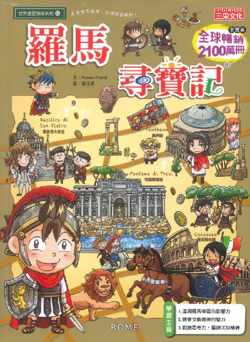 在國家尋寶記系列中,《義大利尋寶記》是唯一破例以2冊來呈現的國家,原因正是因為──羅馬的素材實在太多了,光用一本尋寶記,實在不足以表達羅馬的燦爛!但即使已經有2冊《義大利尋寶記》,羅馬/梵諦岡,依然是個值得讓人獨立深入的專題,畢竟這座城市中,到處都是寶物,不管是羅馬帝國延續兩千年的驚人建築、中世紀的宗教文物,或是文藝復興的巨匠之作,每一樣都是同屬全人類的無價之寶!這次麥克打扮成女生,潛入兒童角鬥士學校擔任臥底,會發生許多有趣的故事、冒險的旅程,也會介紹到許多羅馬最經典的建築藝術作品。