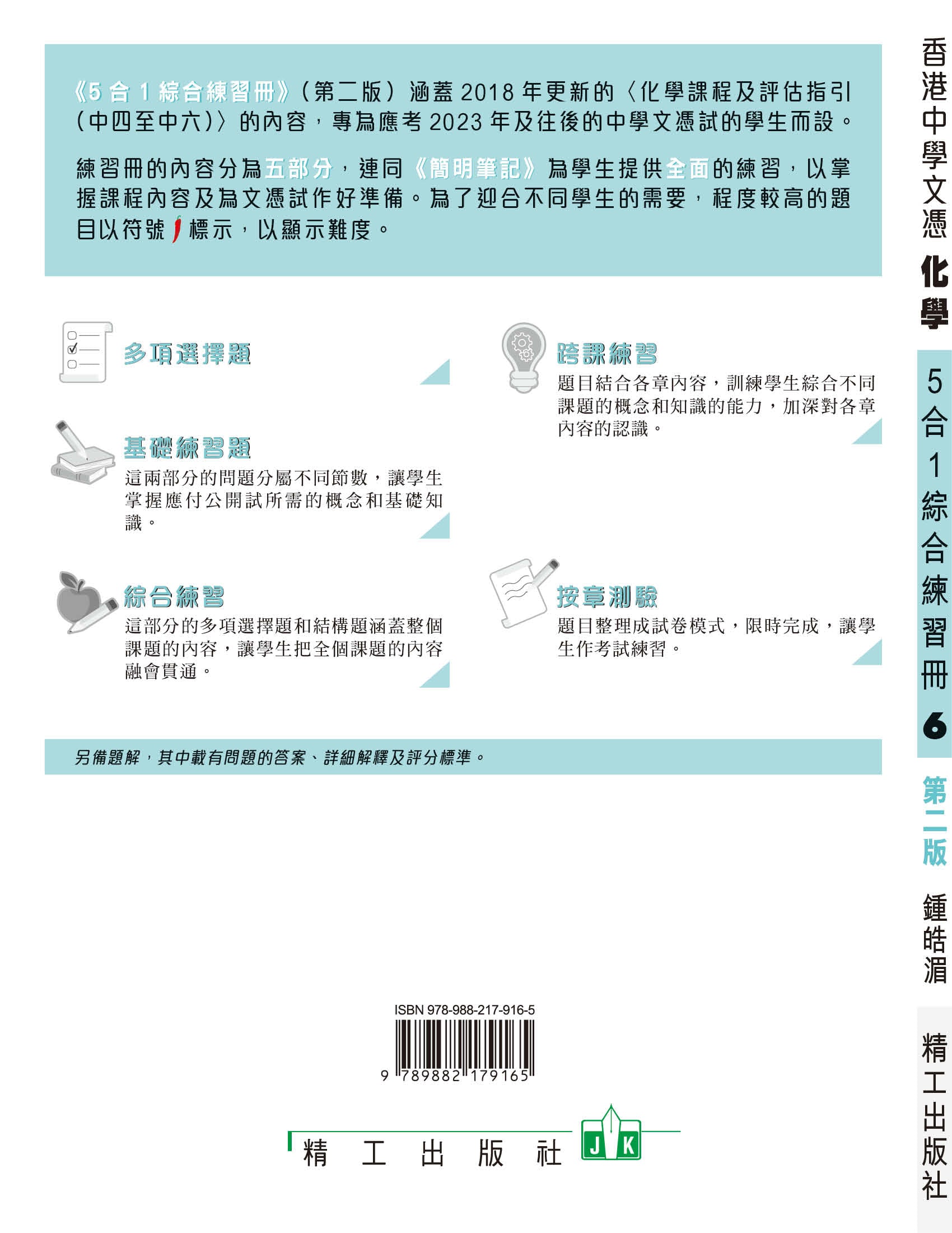 《5 合1 綜合練習冊》( 第二版) 涵蓋2018 年更新的〈化學課程及評估指引(中四至中六)〉的內容,專為應考2023 年及往後的中學文憑試的學生而設。練習冊的內容分為五部分,連同《簡明筆記》為學生提供全面的練習,以掌握課程內容及為文憑試作好準備。為了迎合不同學生的需要,程度較高的題目以符號標示,以顯示難度。