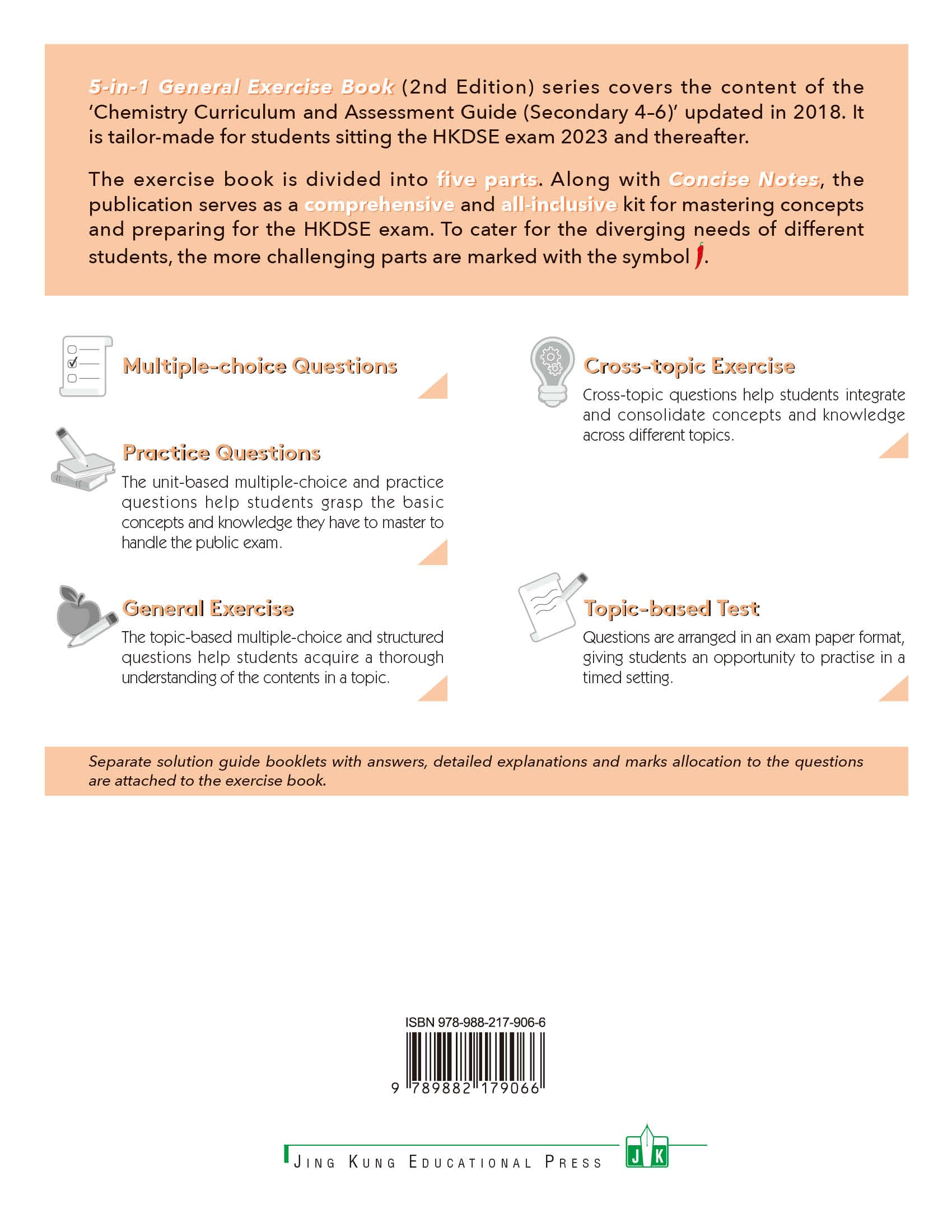 5-in-1 General Exercise Book (2nd Edition) series covers the content of the ‘Chemistry Curriculum and Assessment Guide (Secondary 4–6)’updated in 2018. It is tailor-made for students sitting the HKDSE exam 2023 and thereafter.