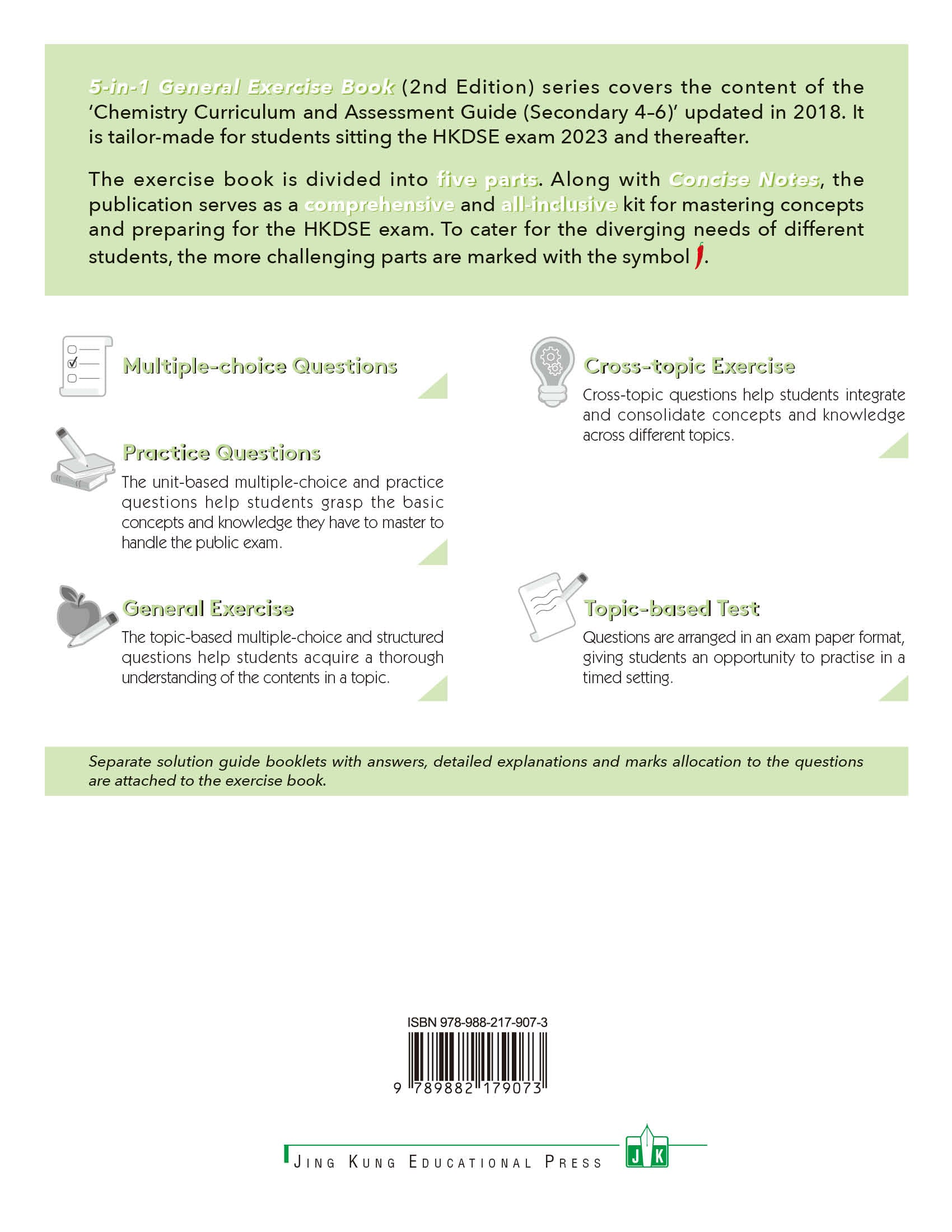 5-in-1 General Exercise Book (2nd Edition) series covers the content of the ‘Chemistry Curriculum and Assessment Guide (Secondary 4–6)’updated in 2018. It is tailor-made for students sitting the HKDSE exam 2023 and thereafter.