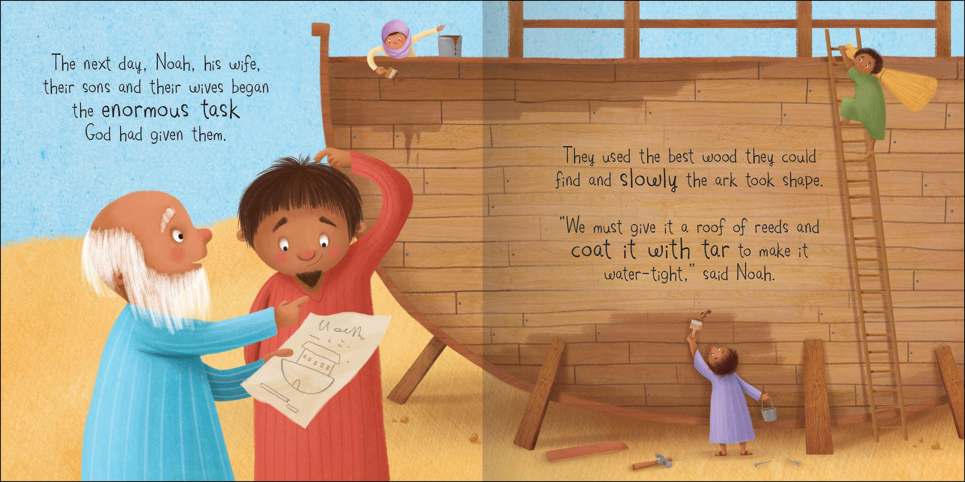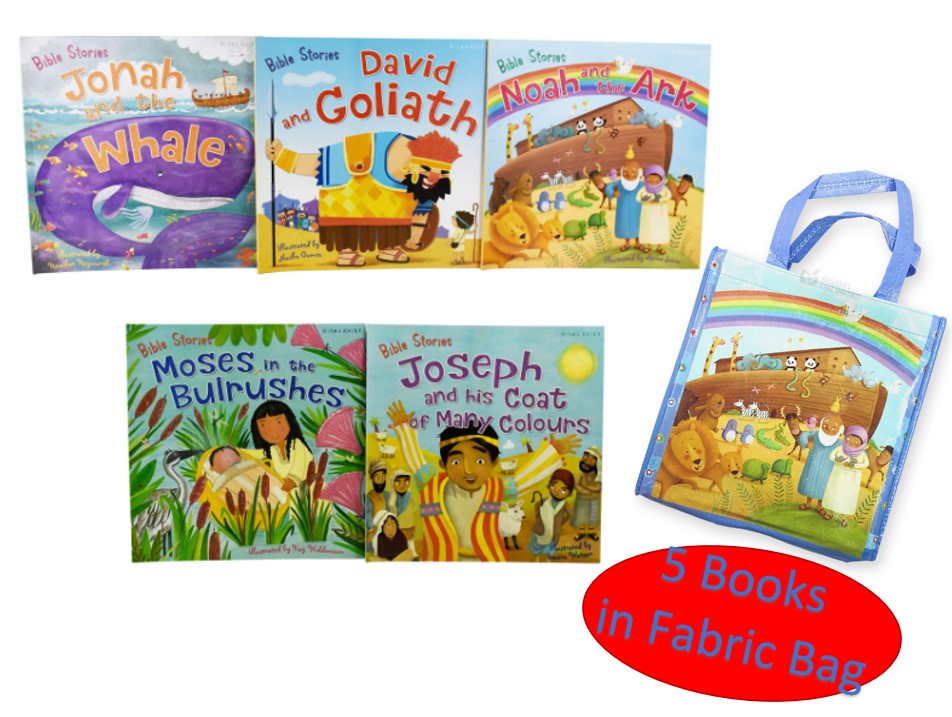 This colorful fabric bag contains five large format Bible picture books. Each book contains one entire story - Noah and the Ark, Joseph and his Coat of Many Colors, Moses in the Bulrushes, David and Goliath and Jonah and the Whale. The pages showcase delightful full-bled artwork packed with charm and detail that will capture children s imaginations, and each book has a dedicated art style. The stories have been carefully retold to appeal to younger readers.