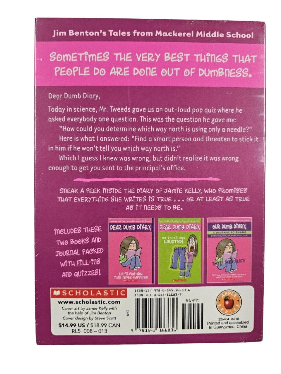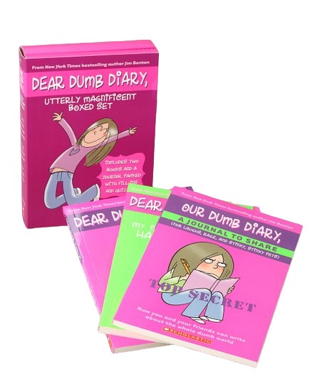 Inside the special fold-out box, you'll find Jamie's first two diaries, plus a paperback edition of Our Dumb Diary --- packed with quizzes, drawings, fill-ins, and more!