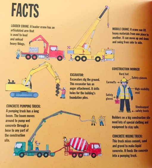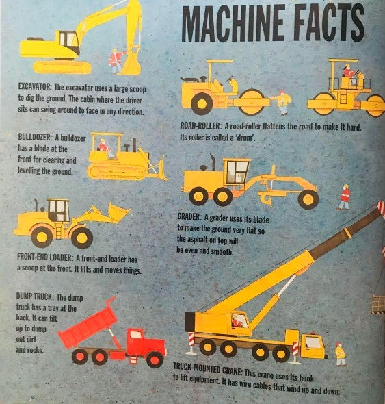 The movement of the heavy machinery is rhythmic, and the contents are easy to understand just by looking at the brightly colored illustrations.