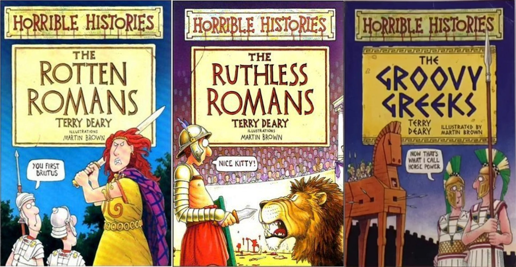 "The Rotten Romans" follows life in Roman Britain, from Nasty Nero to Brave Boudicca. "The Ruthless Romans" reveals the grim truth about the greatest empire of all time. "The Groovy Greeks", meanwhile, is full of fab facts about the hip 'n' happening Greeks who hung out over 200 years ago.